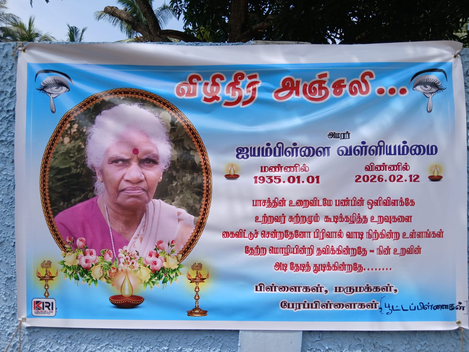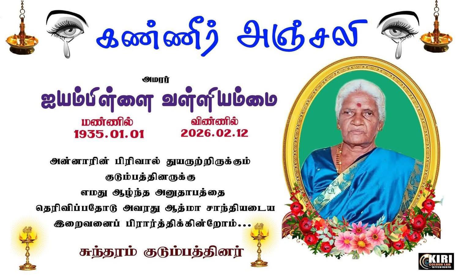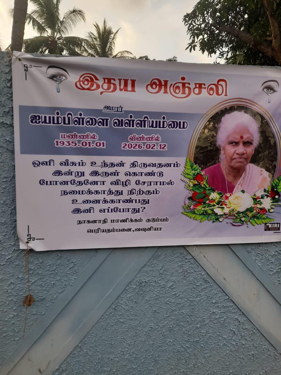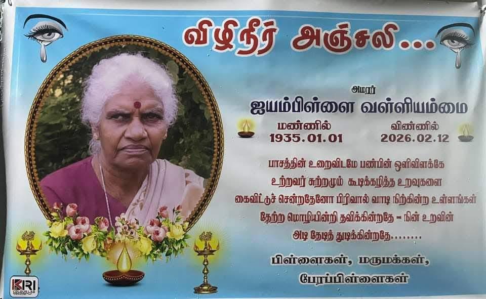 யாழ். நெடுந்தீவு கிழக்கைப் பிறப்பிடமாகவும், இல.482 6ம் யூனிற் இராமநாதபுரத்தை வதிவிடமாகவும் கொண்ட ஐயம்பிள்ளை வள்ளியம்மை அவர்கள் 12-02-2026 வியாழக்கிழமை அன்று இறைபதம் அடைந்தார்.