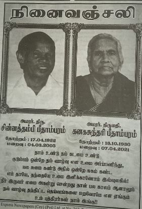 மட்டக்களப்பு நாவற்குடாவைப் பிறப்பிடமாகவும், வசிப்பிடமாகவும் கொண்ட கனகசுந்தரி பீதாம்பரம் அவர்களின் நன்றி நவிலல்.