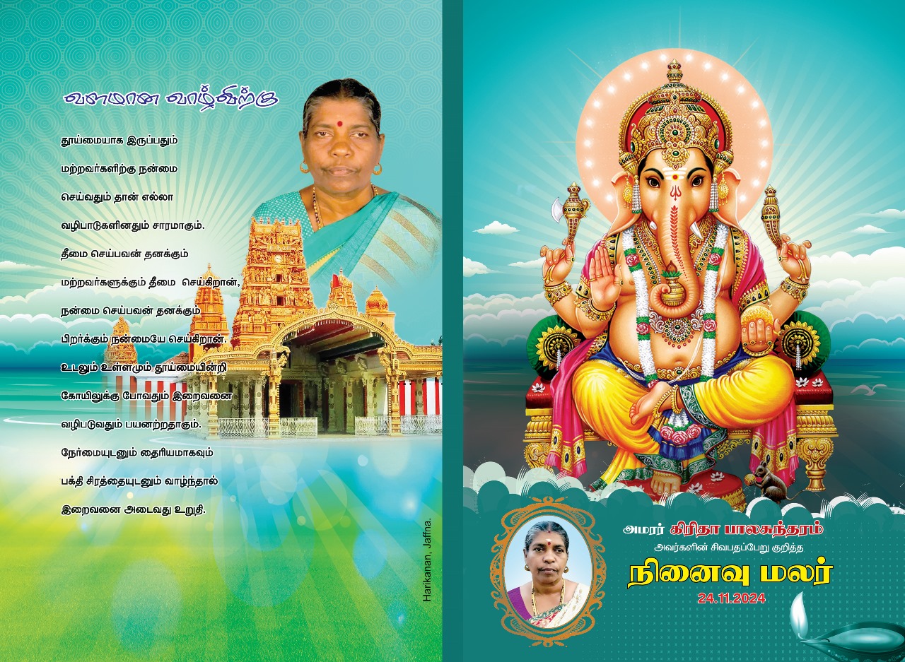 யாழ். வடமராட்சி கிழக்கு அம்பன், குடத்தனையைப் பிறப்பிடமாகவும், வசிப்பிடமாகவும் கொண்டிருந்த கிரிதா பாலசுந்தரம் அவர்களின் முதலாம் ஆண்டு நினைவஞ்சலி.