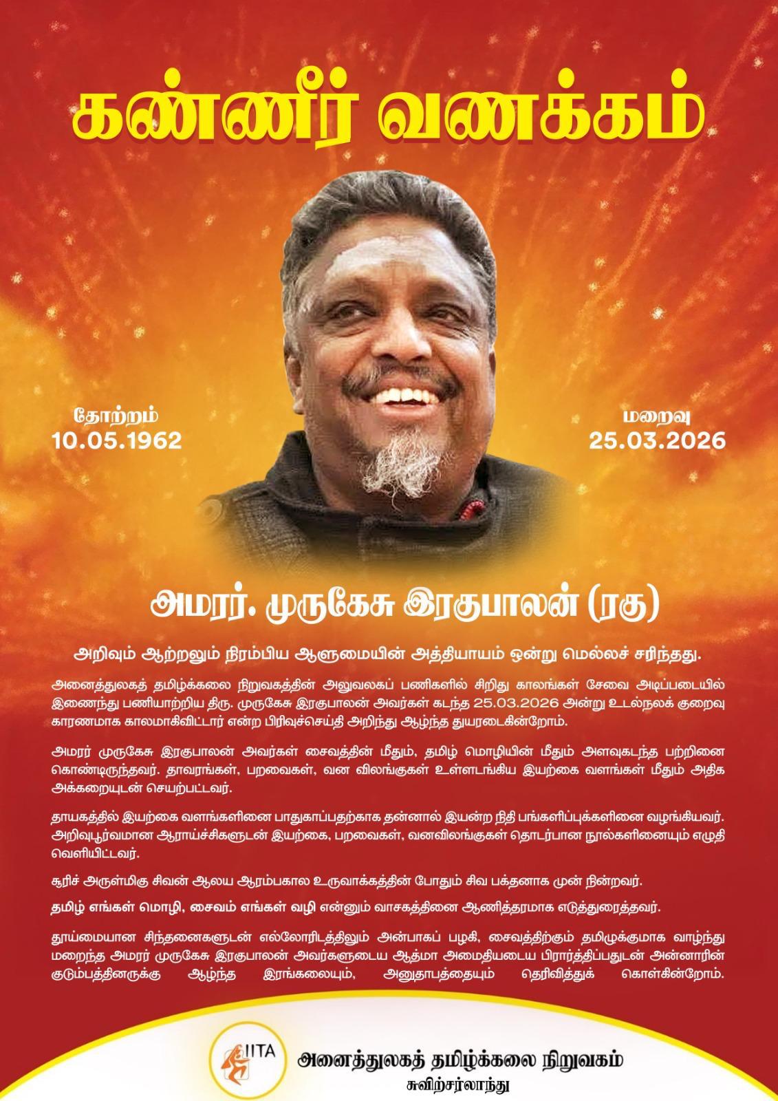 அறிவும் ஆற்றலும் நிரம்பிய ஆளுமையின் அத்தியாயம் ஒன்று மெல்லச் சரிந்தது. தமிழ்க் கல்விச் சேவையின் அலுவலகப் பணிகள், அனைத்துலகத் தமிழ்க்கலை நிறுவகத்தின் அலுவலகப் பணிகள் ஆகியவற்றில் சிறிது காலங்கள் சேவை அடிப்படையில் (எவ்வித கொடுப்பனவுகளும் இல்லாமல்) இணைந்து பணியாற்றிய திரு. முருகேசு இரகுபாலன் அவர்கள் கடந்த 25.03.2026 அன்று உடல்நலக் குறைவு காரணமாக காலமாகிவிட்டார் என்ற பிரிவுச்செய்தி அறிந்து ஆழ்ந்த துயரடைகின்றோம்.