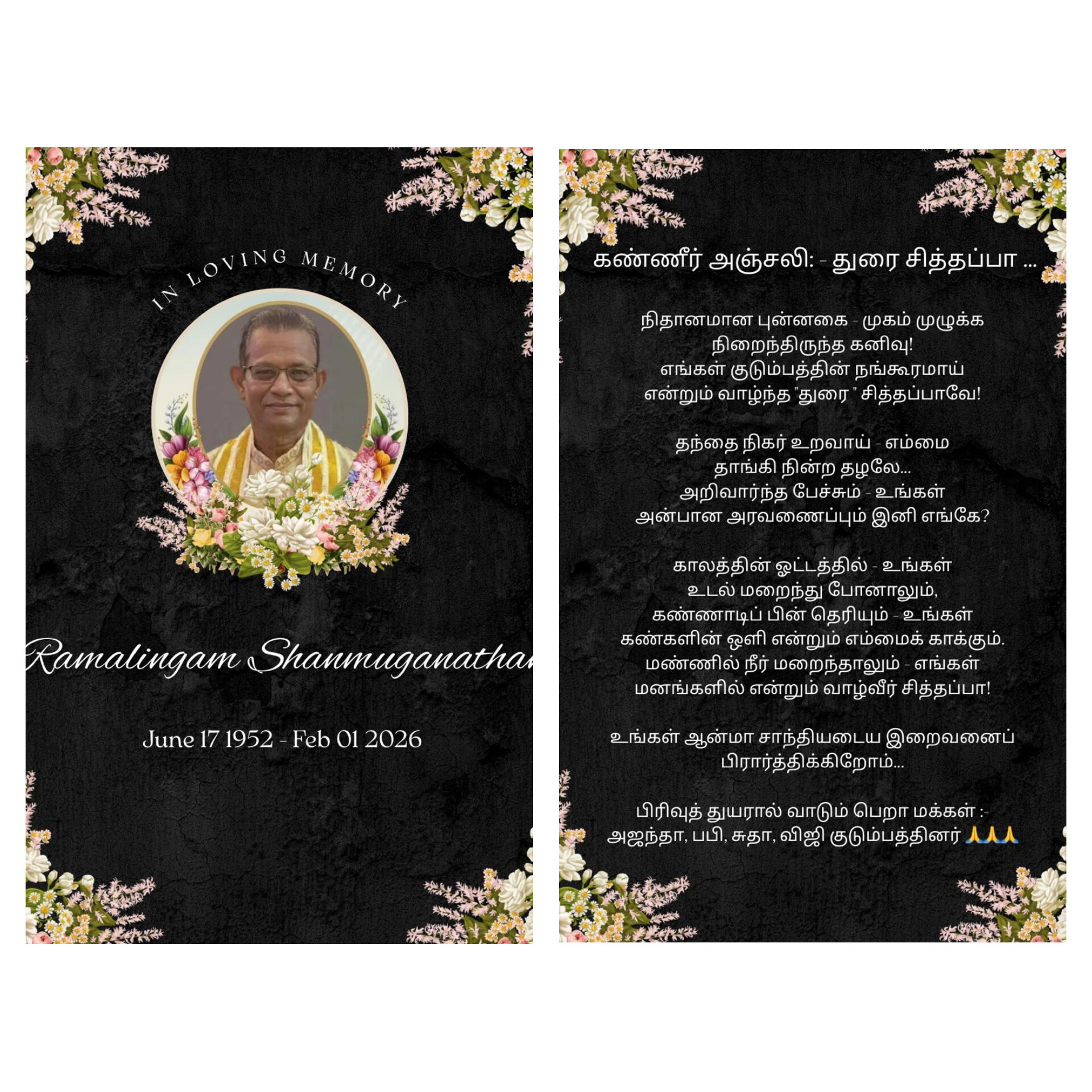 தந்தை நிகர் உறவாய் - எம்மை தாங்கி நின்ற தழலே! பாசத்தின் ஊற்றாய் - என்றும் பண்பின் சிகரமாய் வாழ்ந்தவரே! நிழல் தரும் மரமாய் - எங்கள் நிம்மதிக்குத் துணையாய் இருந்தீர்... சொல்லிச் செல்லா பயணத்தில் - இன்று சொல்லொணாத் துயரில் எமை ஆழ்த்தினீர்! காலங்கள் ஓடினாலும் - உங்கள் கனிவான பேச்சும், மாறாத அன்பும் எம் நினைவில் என்றும் வாடாதே! மண்ணில் நீர் மறைந்தாலும் - எங்கள் மனங்களில் என்றும் வாழ்வீர் சித்தப்பா! உங்கள் ஆன்மா சாந்தியடைய இறைவனைப் பிரார்த்திக்கிறோம்...