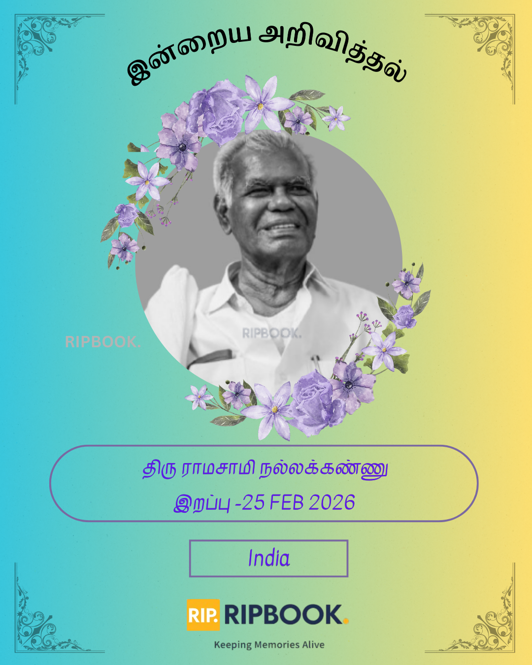 தமிழ்நாட்டின் தூத்துக்குடி மாவட்டம் ஸ்ரீவைகுண்டத்தைப் பிறப்பிடமாகவும், சென்னையை வசிப்பிடமாகவும் கொண்ட இந்திய கம்யூனிஸ்ட் கட்சியின் மூத்த தலைவருமான ஆர். நல்லகண்ணு அவர்கள் 25-02-2026 புதன்கிழமை அன்று இறைவனடி சேர்ந்தார்.
