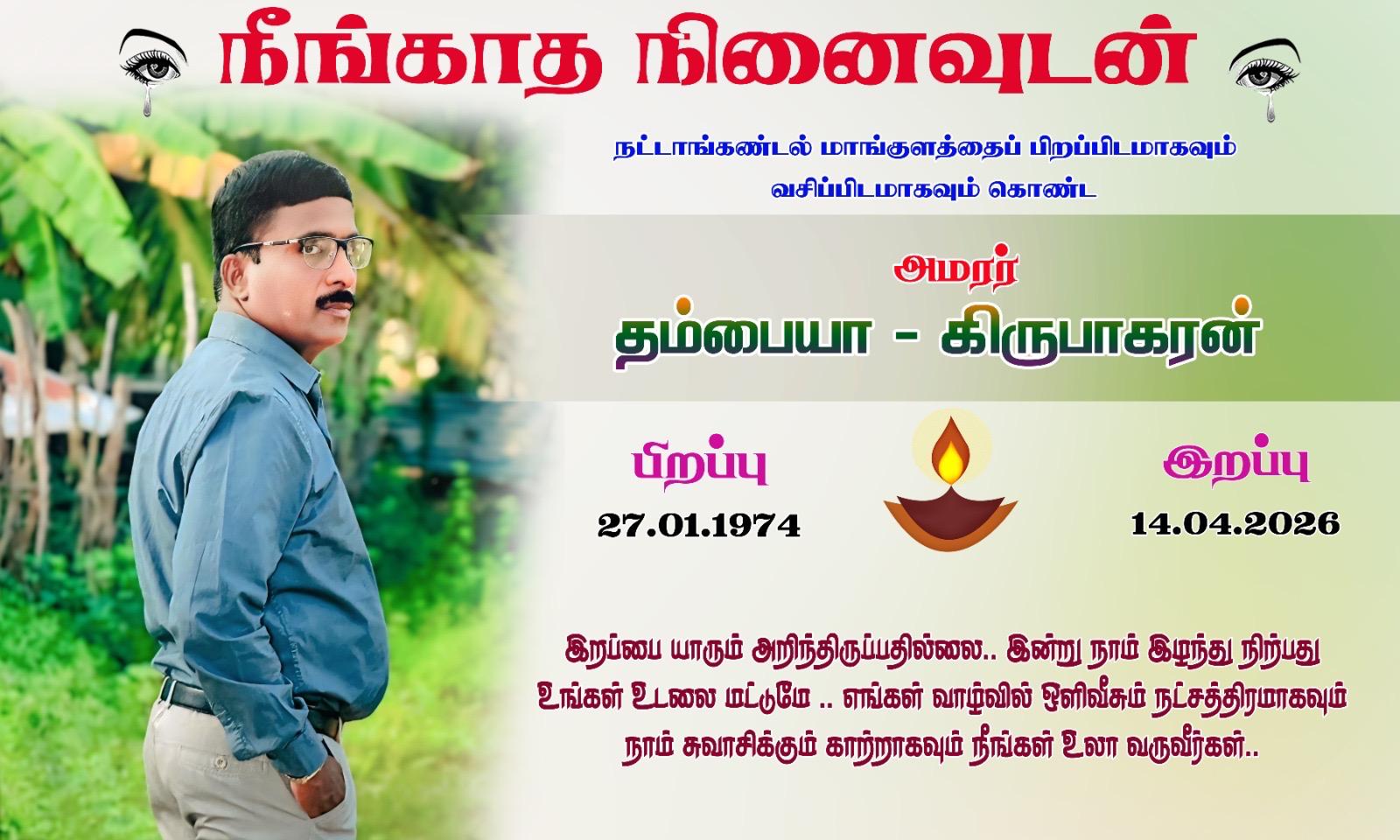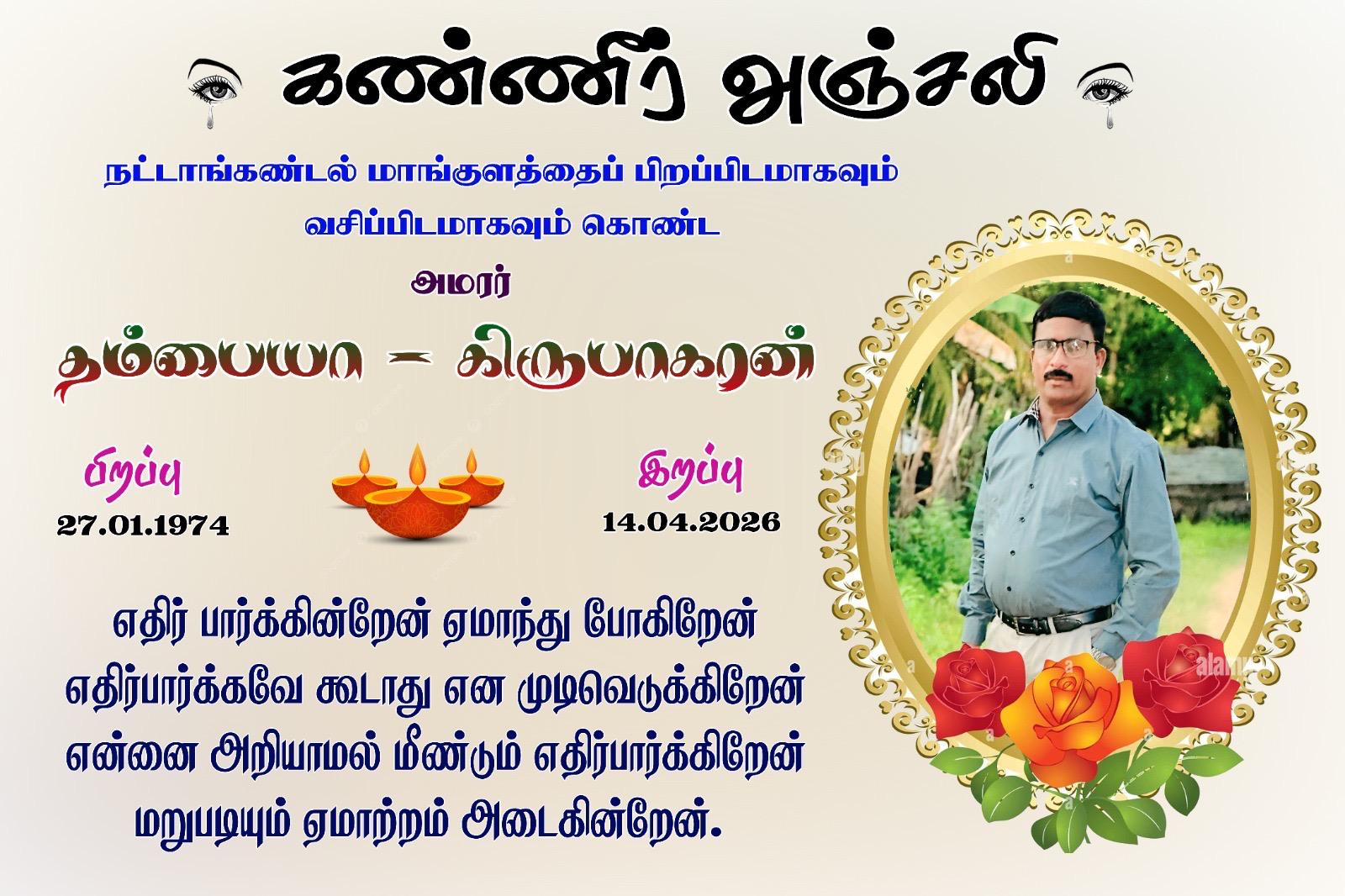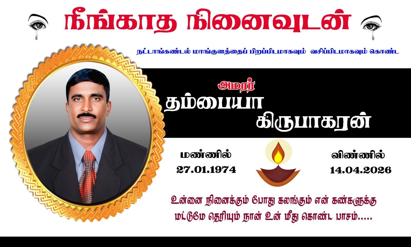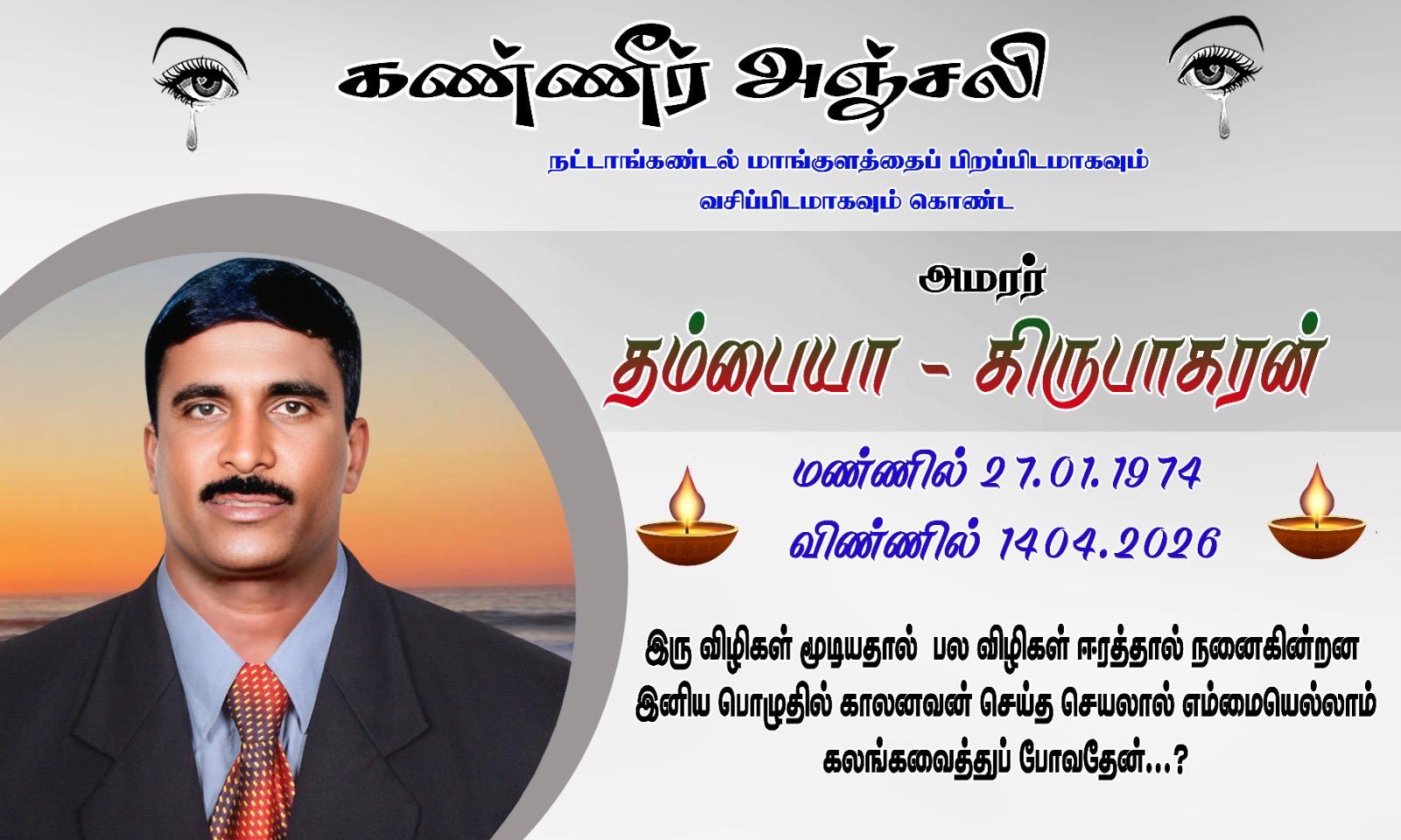 முல்லைத்தீவு நட்டாங்கண்டல் மாங்குளத்தைப் பிறப்பிடமாகவும், வதிவிடமாகவும் கொண்ட தம்பையா கிருபாகரன் அவர்கள் 14-04-2026 செவ்வாய்க்கிழமை அன்று இறைபதம் எய்தினார்.